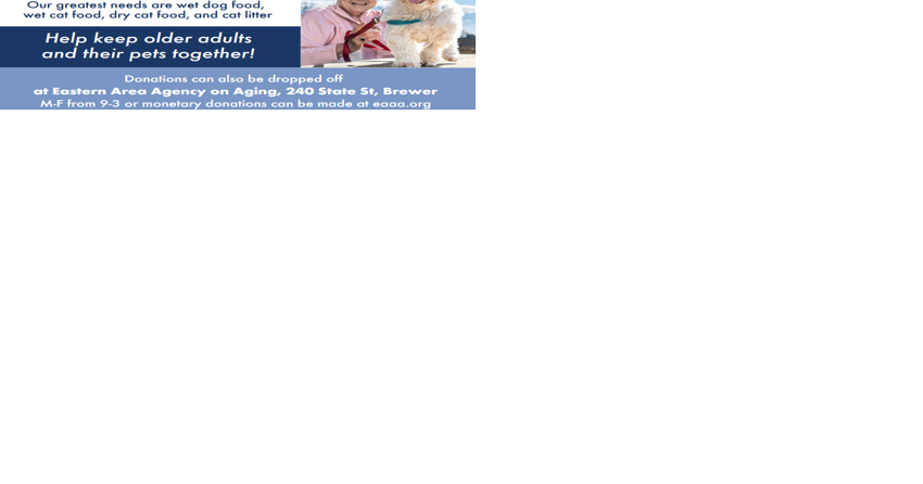 1+ week, 21+ hour ago (186+ words) BANGOR -- For many, pets are more than just a dog to play catch with or a cat to keep the mice away. Three local organizations came together to ensure that everyone can'support themselves, and their furry friends.' This Saturday, the Bangor police department partnered'with the Eastern Area Agency on Aging (EAAA), which runs the Furry Friend Food Bank, to support'older members of the community who struggle to feed'their pets. Members of the police department and the EAAA stood outside of Shaws in Bangor collecting donations.' The effort began in 2013 when the'EAAA delivered meals to support elders living at home but found that there was more to be done.' "There was this kind of issue with them, do I feed myself, do I feed my pet, if I don't feed my pet, I'm gonna lose them. And often times, their pets…...